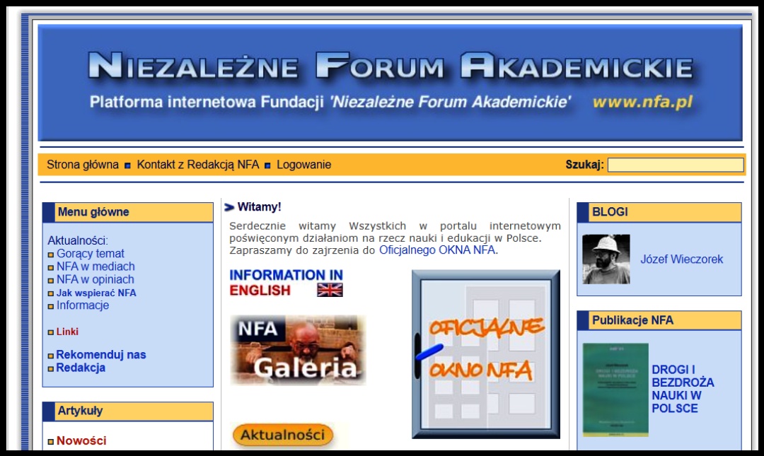 Wcześniej od grudnia 2004 r. funkcjonowała platformowa internatowa NFA którą redagowałem merytorycznie, ze wsparciem technicznym, a jeszcze wcześniej pewna grupa akademików funkcjonowała na platformie Polskiego Cyrku Naukowego (otwarcie na młodych) a jeszcze wcześniej na początku wieku otworzyłem mój blog (obecnie archiwum pod https://wobjw.wordpress.com/) dzięki któremu skupiło się trochę osób zainteresowanych patologiami i naprawą systemu nauki w Polsce.