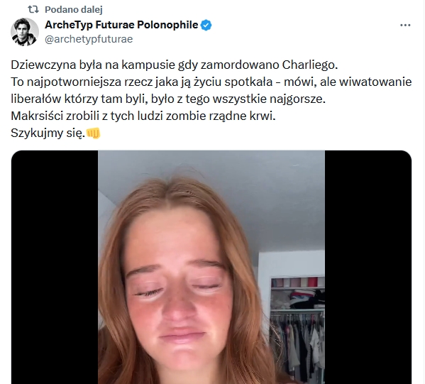 Wybaczcie ale i tu mi coś zgrzyta – brzmi to trochę tak jakby ktoś strzelał na oślep i zabłąkana kula padła akurat na Kirka. ,,Zmarł po postrzeleniu” to mi brzmi bardziej jak jakiś tragiczny błąd podczas polowania na dzika, albo jakby przypadkowy przechodzień znalazł się na linii ognia między policją a przestępcą. O wiele uczciwszy byłby nagłówek: ,,Nie żyje konserwatywny publicysta Charles Kirk – ofiara politycznego morderstwa”.