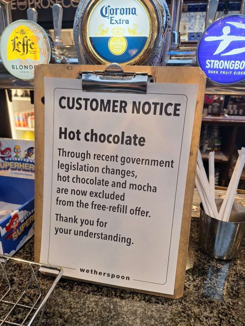 Kawiarnie Morrison’s i puby Wetherspoons również nie będą już oferować bezpłatnego dolewania słodzonych napojów gorących, takich jak gorąca czekolada czy kawa mokka.
