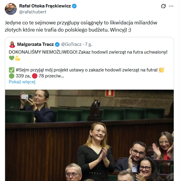 Jeśli ktoś przygląda się uważnie kierunkowi, w którym zmierza państwo, śledzi legislację, to naprawdę nie może nie być przerażony. Na praktycznie KAŻDYM posiedzeniu Sejmu są uchwalane lub przynajmniej prezentowane kolejne akty, mniej lub bardziej znacząco ograniczające naszą wolność na różnych poziomach i w różnych dziedzinach. W czasie tego posiedzenia dwa takie projekty. Zakaz hodowli zwierząt na futra – znów tylko Konfederacja i Republikanie opierają się w całości temu nonsensowi. W PiS, rzecz jasna, dziadzio Kaczyński jak najbardziej za. (…)