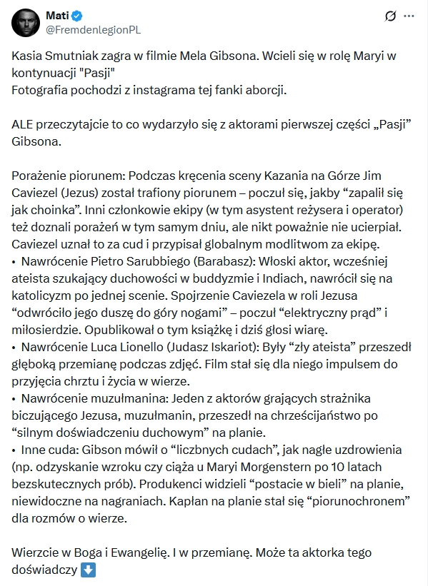 Wracając do wydarzeń światowych. Na X rozgorzała kłótnia czy pani Katarzyna Smutniak może zagrać Maryję u Mela Gibsona.