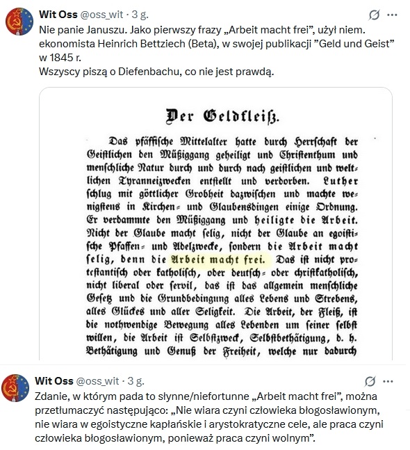 Sprawdziłem i potwierdziło się, dlatego dodałem do wpisu ciekawostkę. Pierwszym autorem myśli “praca czyni wolnym” był Heinrich Beta (Johann Heinrich Bettziech ) w młodości tzw. młodoheglista