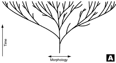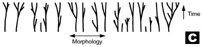 Wracając do końcowego pytania o powstawaniu gatunków, może najbardziej prawdopodobną hipotezą nie jest ani drzewo (A) ani busz (B) tylko sad (C), gdzie pień każdego drzewa reprezentuje oryginalny gatunek podlegający specjacji na różne rasy, typy, rodzaje?