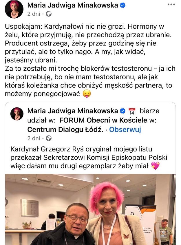 We wpisie na stronie prywatnej w październiku 2024 i wywiadzie udzielonym w listopadzie 2024 dr Marek Jerzy Minakowski podkreślił, że obecnie nazywa się Maria Jadwiga Minakowska