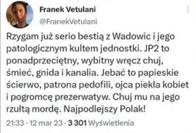 Wyznawca XI przykazania, nieobojętny na kult św. Jana Pawła II  Franciszek Vetulani uznany przez sąd za winnego ale bez kary