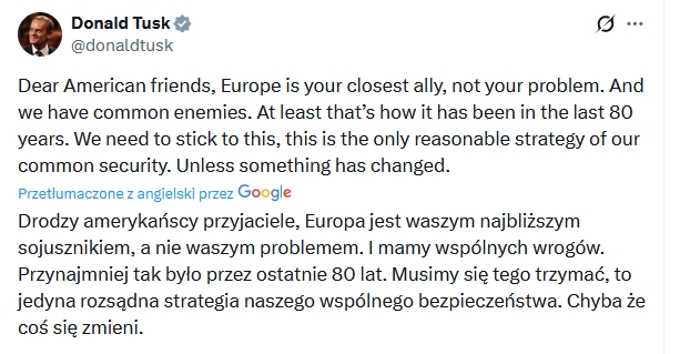 Jako wieloletni rzecznik antypolskich interesów nazywanych unijnymi, wiedząc o ostatnim konflikcie pomiędzy antyeuropejską UE a USA, Tusk specjalnie użył propagandowego sloganu, pisząc o „Europie”. Tym samym szef neomarksistowskiej KO po raz kolejny podszywa się pod kogoś kim od dawna nie jest, udając Polaka i Europejczyka. Gwoli ścisłości najbardziej proeuropejskim i propolskim hasłem w tej chwili jest: Europa – Tak, UE – Nie!