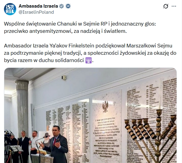 Obrządek palenia Chanuki w Pałacu Prezydenckim zapoczątkował wybitny przedstawiciel targowicy lizbońskiej, Lech Kaczyński. W tym roku tradycję tę przerwał nowy prezydent, Karol Nawrocki.