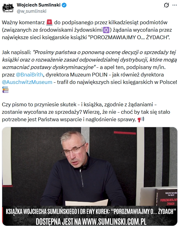 Środowiska żydowskie domagają się wycofania ze sprzedaży książki „Porozmawiajmy o… Żydach”, autorstwa Wojciecha Sumlińskiego i historyk dr Ewy Kurek. Tak twierdzi Wojciech Sumliński, ujawniając treść listu podpisanego przez blisko sto podmiotów.