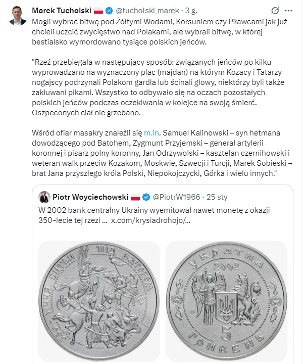 “Ukraina idzie w stronę cywilizacji zachodniej”-ale w domyśle tej łacińskiej, nie obecnej “zachodniej” opartej na wartościach Talmudu? Bo jeżeli tak, to idą już długo i dojść nie mogą. Czasu było dość z naddatkiem by parę razy Ziemię okrążyć na piechotę. O jakości cywilizacyjnej “kultury ukraińskiej” współczesnej wybornie świadczy upamietnianie monetarne bitwy, która kojarzy się wyłącznie z masowym mordowaniem jeńców. To już nie są jakieś “ekstremistyczne odpryski”, to jest główny nurt. Faktycznie, mamy z nimi “wspólne wartości”…