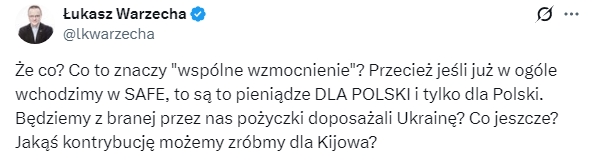 Państwo polskie realizujące politykę określaną mianem unijnej lub niemieckiej ma zaciągnąć kolejną pożyczkę. Kwotą kredytu będą manipulować nasi wrogowie. Rosja? Nie, Niemcy i Ukraina. Manipulacja będzie polegać na decydowaniu na co mamy wydać polską „pożyczkę”. Zgodnie z założeniem nie będziemy mogli kupować najlepszego uzbrojenia, a takie – nie zawsze, ale często jest w USA. Uzbrojenie ma być “europejskie”. W domyśle m.in. niemieckie, a w założeniach kapitał firm produkujących uzbrojenie, nawet tych w Polsce musi być “europejski”.