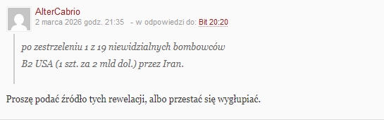 Część Pana komentarzy, powtarzam: ich pewna część składa się z plotek, domysłów, a nawet propagandy jednej ze stron konfliktu. Prosimy, aby Pan nie zamieszczał tego typu sensacji vide lotniczych domysłów lub informacji o paznokciach piłkarza.
