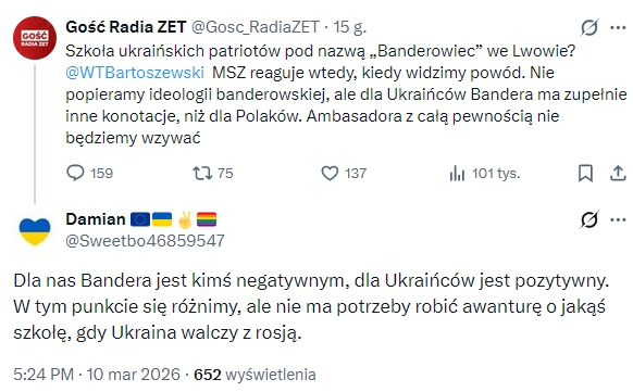 Na pytanie redaktora Rymanowskiego o nowo powstałą szkołę pod patronatem Bandery, Bartoszewski wykazał się szacunkiem dla konotacji. Polskich? Nie, ukraińskich. W sukurs ministrowi Tuska przyszli członkowie „silnych razem”, którzy zaczęli rzucać onucami.