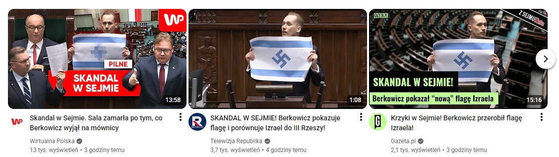 – powiedział poseł Konrad Berkowicz, prezentując na mównicy sejmowej flagę Izraela z dodaną swastyką