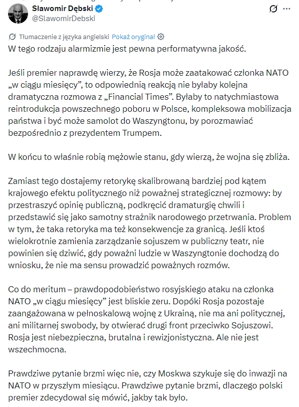 Donald Tusk, jeden z najbardziej aktywnych neopolityków w Polsce, zwrócił uwagę w rozmowie z Financial Times na możliwość rozpoczęcia wojny w ciągu kilku miesięcy.